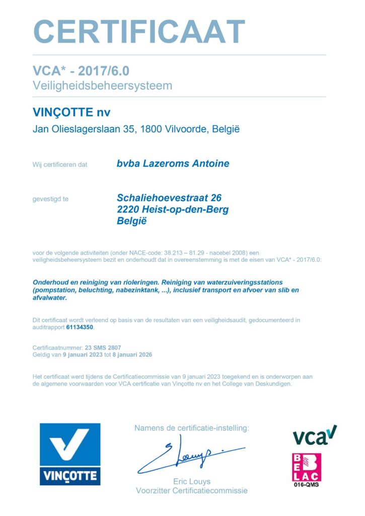 Dankzij deze technologie kunnen we grote volumes en kilometers riolering per dag verwerken op een milieuvriendelijke manier. Daarnaast zijn wij een erkend en geregistreerd aannemer, beschikken over een OVAM-erkenning en zijn we VCA-gecertificeerd. Al ons personeel heeft een Basis-VCA, en de nodige veiligheids- en besloten-ruimteopleidingen.